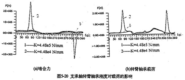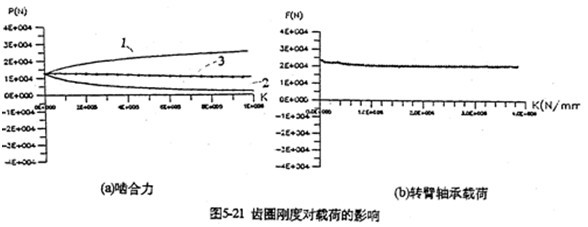 只考慮行星軸承變形及齒板變形時(shí),影響三環(huán)減速器載荷特性的剛度,主要是行星軸承剛度、和內(nèi)齒圈的變形剛度。軸承剛度與軸承材料、間隙、油膜等很多因素有關(guān)。圖5-19是輸入軸行星軸承剛度對嚙合力及行星軸承載荷的影響。當(dāng)輸入行星軸承剛度小一個(gè)數(shù)量級時(shí),負(fù)向嚙合力區(qū)域增大(見圖5-19a);隨剛度減小、各相嚙合力越不均恒(圖5-19b),輸入軸行星軸承剛度的影響比輸入軸行星軸承剛度更大,見圖5-20所示。嚙合力及各行星軸承載荷在軸承剛度較小的情況時(shí),都出現(xiàn)正常載荷的10倍以上的沖擊現(xiàn)象,沖擊產(chǎn)生的位置隨剛度變化不同。內(nèi)齒圈剛度對載荷的影響與行星軸承剛度相反(見圖5-21所錄)。當(dāng)剛度越小時(shí),三相齒板的嚙合力越均恒(見圖5-21a),而且行星軸承載荷幅值基本上不變(見圖5-21b)。同此可推知,減小三環(huán)減速器振動的途徑之一就是提高行星軸承剛度,減小內(nèi)齒圈剛度。這可以通過對行星軸承進(jìn)行預(yù)緊,和采用軟齒面或大柔度齒圈的辦法,以使嚙合力和行星軸承載荷均衡化,以達(dá)到減振降噪的目的。