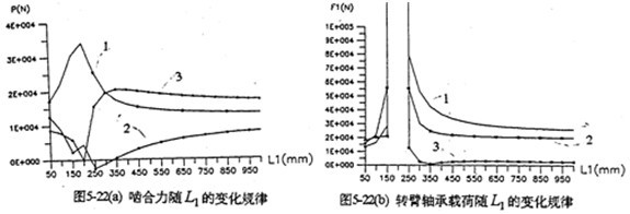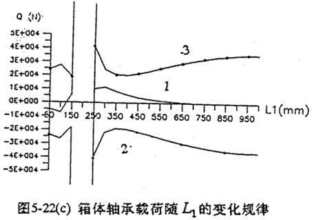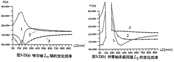 各軸水平布置時(shí),軸間的中心距變化,將引起各載荷大小幅值、規(guī)律均發(fā)生變化。圖5-22是輸入軸相對輸出軸位置變化時(shí),減速器的嚙合力及軸承載荷變化情況。由圖可知,當(dāng)輸入軸與支承軸中心距(L2=200mm)很小時(shí),三齒板的嚙合力分配很不均衡,隨著L1的增加嚙合力趨于均衡(見圖5-22a)。行星軸承載荷變化情況見圖5-22b所示。