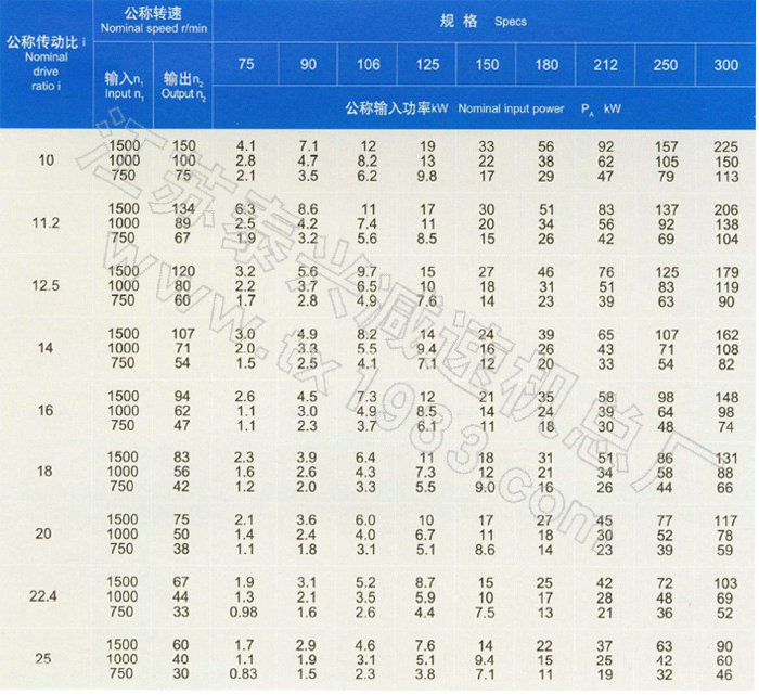 212、250、300九種規(guī)格。每一規(guī)格的傳動比有10、11.2、12.5、14、16、18、20、22.4、25九種。
