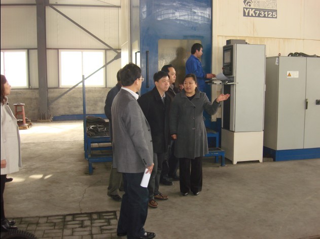 韓祝強(qiáng)縣長、張軍會(huì)長、劉占坤總經(jīng)理在大型數(shù)控磨齒機(jī)旁