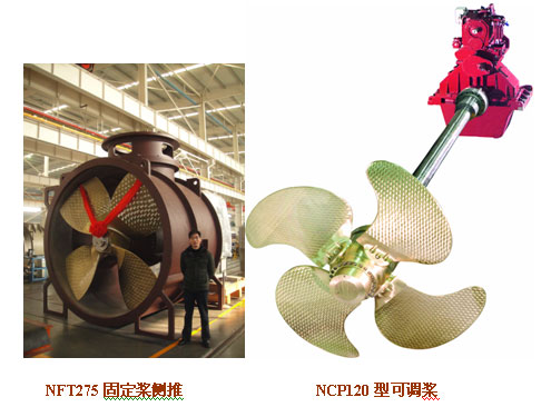 其中NCP120型可調(diào)槳最大傳遞能力為55.4kW/rpm,螺旋槳最大推力達110t,是目前國內(nèi)傳遞能力最大,推力最大的可調(diào)槳;NFT275固定槳側(cè)推最大傳遞功率為3000HP,槳葉直徑2750mm,是目前國內(nèi)生產(chǎn)的規(guī)格最大的側(cè)推;CGS船用齒輪箱具有承載推力大、齒輪承載能力高、穩(wěn)定性好等特點,在相同工況下相較傳統(tǒng)產(chǎn)品在選型上可以降低一個規(guī)格,從而減少了齒輪箱的重量,降低了船廠采購成本;CKV可調(diào)槳船用齒輪箱是為可調(diào)槳推進系統(tǒng)專配的齒輪箱,可以一個輸入拖帶二到四個輸出,具有結(jié)構(gòu)新穎,體積小、性價比高等特點。