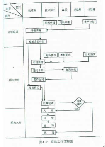 第四步競購。由進入競購范圍的供應單位或個人向供應科提交申報單,載明:所競購物資名稱、產地、規(guī)格、數量、質量、價格、交貨期、供應渠道、售后服務等,一式兩份呈報物管辦和供應科公開進行競購。供應科根據生產供應計劃和所掌握的最低競價,選定2~3家為供貨單位,報物管辦備查。最后由供應科與供貨單位簽訂合同,具體實施物資采購進廠。 競購成功并簽訂合同的供貨單位須按合同要求,及時、保質保量地供貨。若中途違約或物資使用過程中發(fā)現內在質量問題而造成損失、影響生產,則按規(guī)定承擔違約責任。凡違約或質量問題影響生產兩次以上者,一律取消其競購資格。 全程監(jiān)控 為明確各方面責任,公司從提出用料申請、編制物資采購計劃開始,到驗收入庫、生產使用為止,制定了詳細的業(yè)務流程,所有環(huán)節(jié)一律按工作程序進行全程管理。詳見圖4—2采購工作流程圖。 成本管理科將上述流程活動中所涉及的各類信息資料如原輔材料的價格、質量、數量、供貨單位及聯系人、責任人等輸入微機,隨時進行查詢、分析、全程追蹤監(jiān)控。