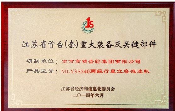 近日,南高齒齒輪集團子公司——南京高精齒輪集團有限公司獲得由江蘇省經(jīng)信委頒發(fā)的認定證書,公司自主研制的“MLXSS540兩級行星立磨減速機”被認定為江蘇省首臺(套)重大裝備。江蘇省首臺(套)重大裝備及關鍵部件的認定和應用示范,旨在鼓勵發(fā)展高端制造領域自主研制的高新技術(shù)裝備、大型成套裝備及其關鍵部件。