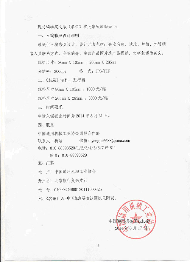 上述申請(qǐng)經(jīng)中國(guó)通用機(jī)械工業(yè)協(xié)會(huì)確認(rèn),即具合同效力,雙方必須履行其有關(guān)責(zé)任和義務(wù)。請(qǐng)收到確認(rèn)回執(zhí)后即將《名錄》制作發(fā)行費(fèi)匯入指定帳戶(hù)。
