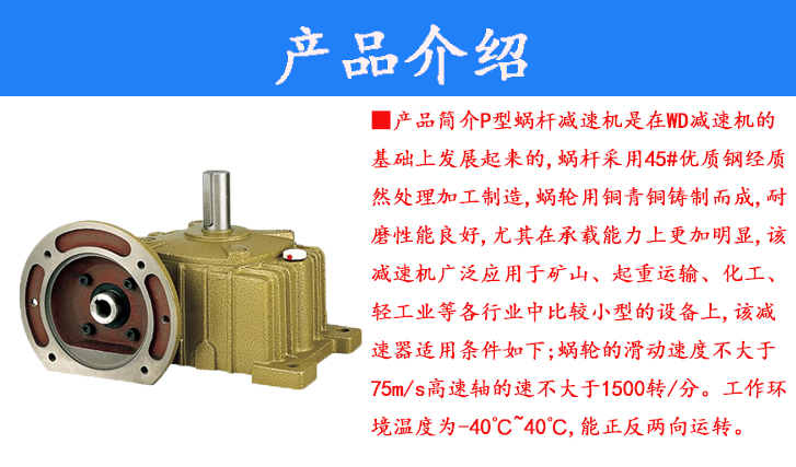 P型蝸桿減速機是在WD減速機的基礎(chǔ)上發(fā)展起來的,蝸桿采用45#優(yōu)質(zhì)鋼經(jīng)質(zhì)然處理加工制造,蝸輪用銅青銅鑄制而成,耐磨性能良好,尤其在承載能力上更加明顯,該減速機廣泛應(yīng)用于礦山、起重運輸、化工、輕工業(yè)等各行業(yè)中比較小型的設(shè)備上,該減速器適用條件如下;蝸輪的滑動速度不大于75m/s高速軸的速不大于1500轉(zhuǎn)/分。工作環(huán)境溫度為-40℃~40℃,能正反兩向運轉(zhuǎn)。