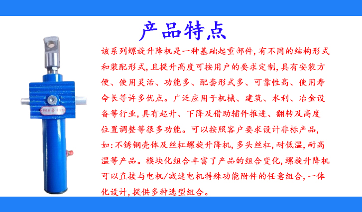 該系列螺旋升降機是一種基礎起重部件,有不同的結構形式和裝配形式,且提升高度可按用戶的要求定制,具有安裝方便、使用靈活、功能多、配套形式多、可靠性高、使用壽命長等許多優(yōu)點。廣泛應用于機械、建筑、水利、冶金設備等行業(yè),具有起升、下降及借助輔件推進、翻轉及高度位置調整等很多功能?梢园凑湛蛻粢笤O計非標產品,如:不銹鋼殼體及絲杠螺旋升降機,多頭絲杠,耐低溫,耐高溫等產品。模塊化組合豐富了產品的組合變化,螺旋升降機可以直接與電機/減速電機特殊功能附件的任意組合,一體化設計,提供多種選型組合