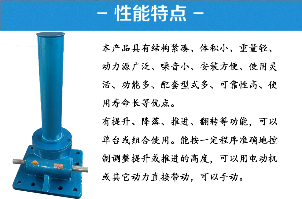 承載能力2.5—120T。具有結(jié)構(gòu)緊湊、積小、重量輕、動力源廣泛、無噪音、安裝方便、使用靈活、功能多、配套形式多、可靠性高、使用壽命長許多優(yōu)點。具有提升、降落、推進、翻轉(zhuǎn)等多種功能,可以單臺或組合使用,能按一定程序準確地控制調(diào)整升或推進的高度,可以用電動機或其它動力直接帶動,也可以手動。最高輸入轉(zhuǎn)速1500r/min,最大提升速2.7m/min。有不同的結(jié)構(gòu)型式和裝配方式,提升高度按用戶的要求制造。該裝置可以自鎖。