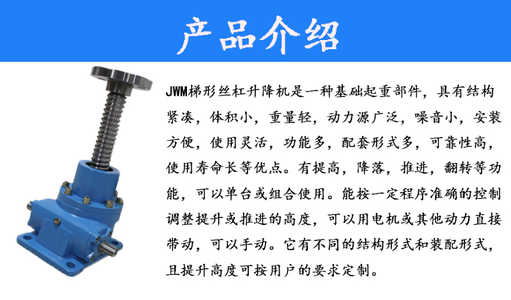 JWM梯形絲杠升降機(jī)是一種基礎(chǔ)起重部件,具有結(jié)構(gòu)緊湊、體積小、重量輕、動(dòng)力源廣泛、無噪音、安裝方便、使用靈活、功能多、配套形式多、可靠性高、使用壽命長等許多優(yōu)點(diǎn)?梢詥闻_或組合使用,能按一定程序準(zhǔn)確地控制調(diào)整提升或推進(jìn)的高度,也可以用電動(dòng)機(jī)或其它動(dòng)力直接帶動(dòng),也可以手動(dòng)。它有不同的結(jié)構(gòu)形式和裝配形式,且提升高度可按用戶的要求定制。