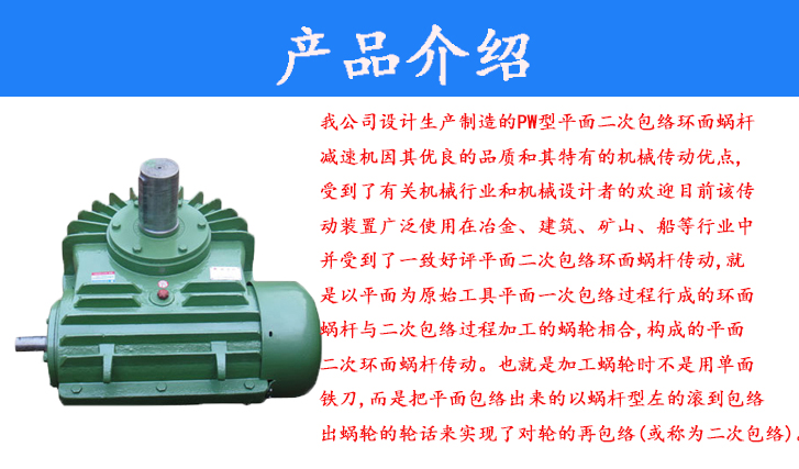 我公司設計生產(chǎn)制造的PW型平面二次包絡環(huán)面蝸桿減速機因其優(yōu)良的品質(zhì)和其特有的機械傳動優(yōu)點,受到了有關機械行業(yè)和機械設計者的歡迎目前該傳動裝置廣泛使用在冶金、建筑、礦山、船等行業(yè)中并受到了一致好評平面二次包結環(huán)面蝸桿傳動,就是以平面為原始工具平面一次包絡過程行成的環(huán)面蝸桿與二次包絡過程加工的蝸輪相合,構成的平面二次環(huán)面蝸桿傳動。也就是加工蝸輪時不是用單面鐵刀,而是把平面包絡出來的以蝸桿型左的滾到包絡出蝸輪的輪話來實現(xiàn)了對輪的再包絡(或稱為二次包絡)