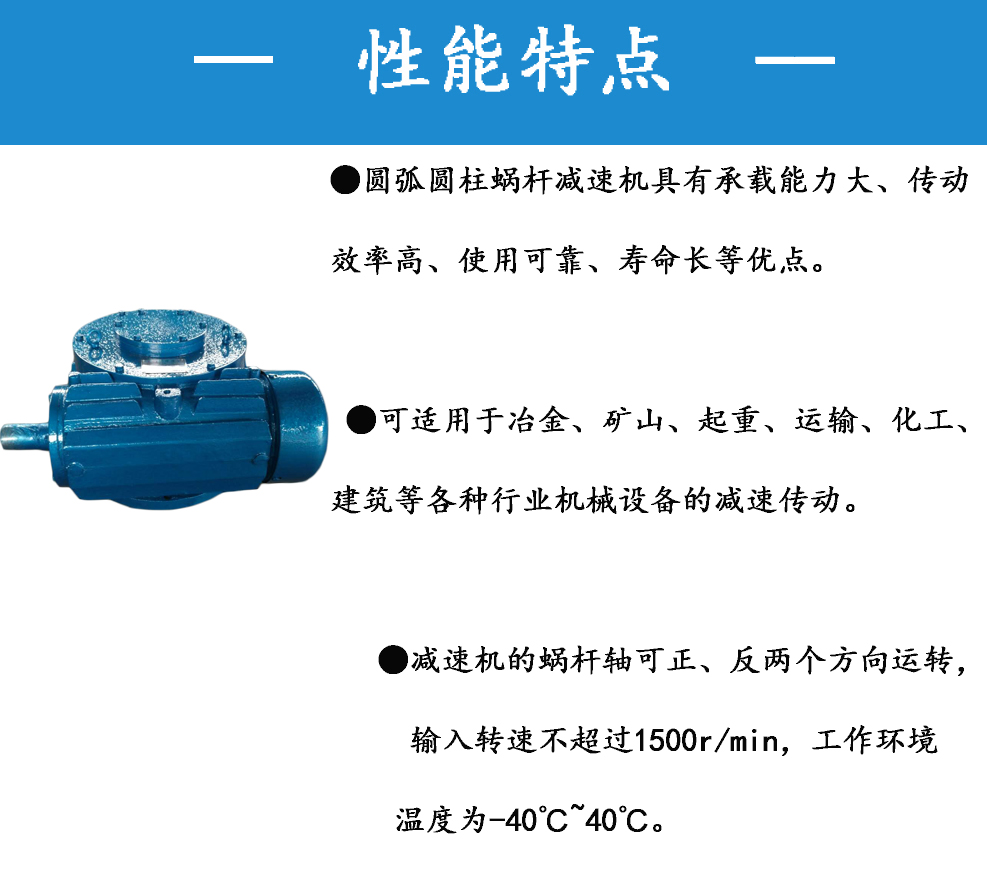 圓弧圓柱蝸桿減速機具有承載能力大、傳動效率高、使用可靠、壽命長等優(yōu)點,可適用于冶金、礦山、起重、運輸、化工、建筑等各種行業(yè)機械設(shè)備的減速傳動。減速機的蝸桿軸可正、反兩個方向運轉(zhuǎn),輸入轉(zhuǎn)速不超過1500r/min,工作環(huán)境溫度為-40℃-40℃。