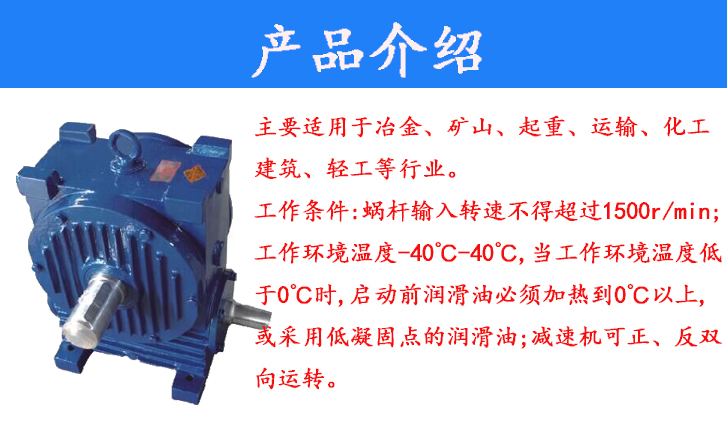 主要適用于冶金、礦山、起重、運(yùn)輸、化工、建筑、輕工等行業(yè)。工作條件:蝸桿輸入轉(zhuǎn)速不超過1500r/min;工作環(huán)境溫度為-40~40℃,當(dāng)工作環(huán)境溫度低于0℃時(shí),啟動(dòng)前潤(rùn)滑油必須加熱到0℃以上,或采用低凝固點(diǎn)的潤(rùn)滑油;減速器可正、反雙向運(yùn)轉(zhuǎn)。