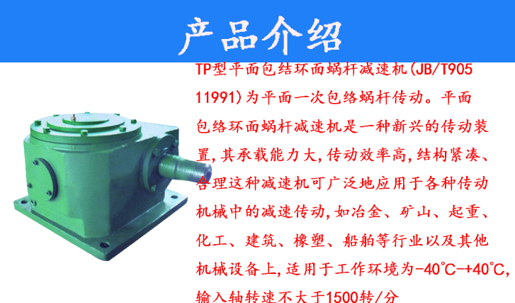 TP型平面包結(jié)環(huán)面蝸桿減速機(jī)(JB/T90511991)為平面一次包絡(luò)蝸桿傳動(dòng)。平面包絡(luò)環(huán)面蝸桿減速機(jī)是一種新興的傳動(dòng)裝置,其承載能力大,傳動(dòng)效率高,結(jié)構(gòu)緊湊、合理這種減速機(jī)可廣泛地應(yīng)用于各種傳動(dòng)機(jī)械中的減速傳動(dòng),如冶金、礦山、起重、化工、建筑、橡塑、船舶等行業(yè)以及其他機(jī)械設(shè)備上,適用于工作環(huán)境為-40℃-+40℃,輸入軸轉(zhuǎn)速不大于1500轉(zhuǎn)/分