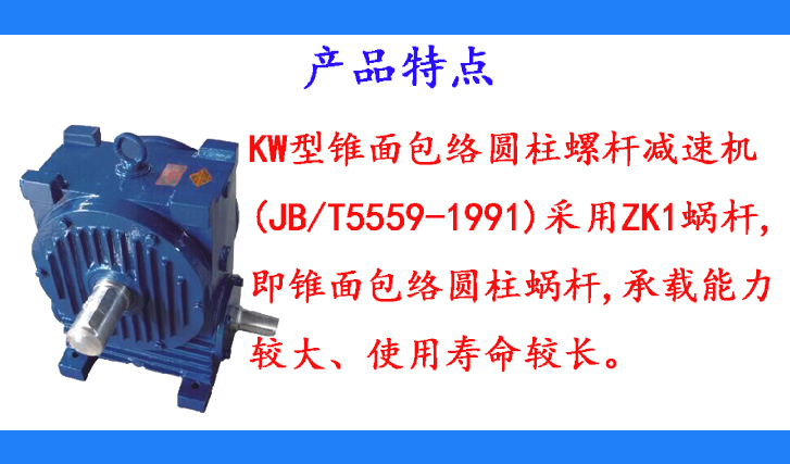 KW型錐面包絡圓柱螺桿減速機(JB/T5559-1991)采用ZK1蝸桿,即錐面包絡圓柱蝸桿,承載能力較大、使用壽命較長。