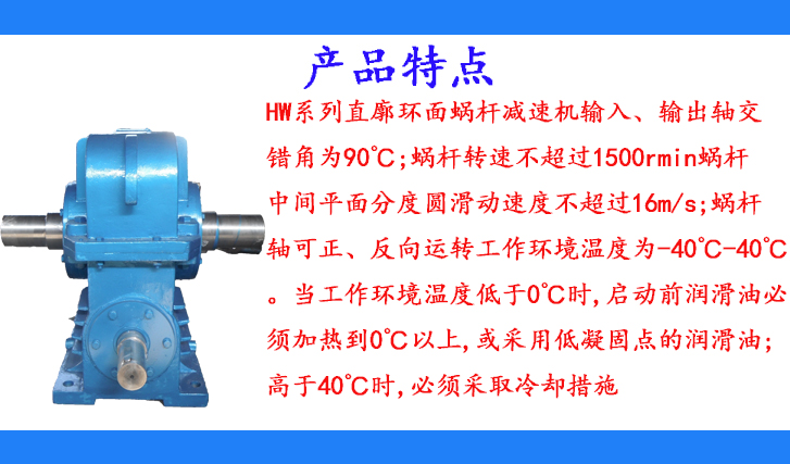 HW系列直廓環(huán)面蝸桿減速機(jī)輸入、輸出軸交錯角為90℃;蝸桿轉(zhuǎn)速不超過1500rmin蝸桿中間平面分度圓滑動速度不超過16m/s;蝸桿軸可正、反向運(yùn)轉(zhuǎn)工作環(huán)境溫度為-40℃-40℃。當(dāng)工作環(huán)境溫度低于0℃時(shí),啟動前潤滑油必須加熱到0℃以上,或采用低凝固點(diǎn)的潤滑油;高于40℃時(shí),必須采取冷卻措施