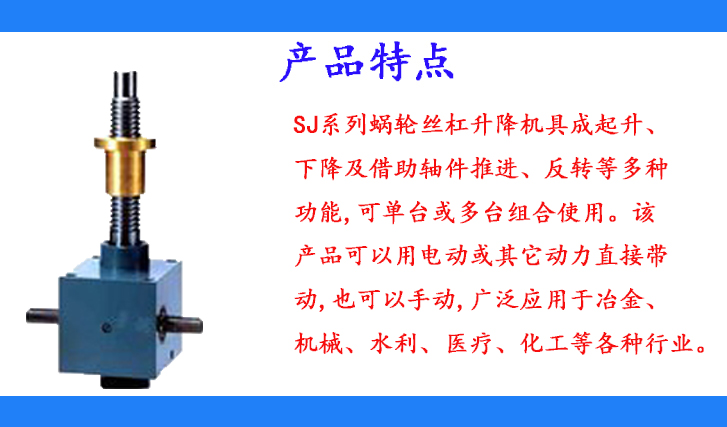 SJ系列蝸輪絲杠升降機(jī)是我公司參照國外公司的產(chǎn)品而設(shè)計(jì)的新型系列產(chǎn)品,該產(chǎn)品是一種起重部件,和其他系列蝸輪絲杠升降機(jī)相比具有結(jié)構(gòu)緊湊、體積小、安裝方便、輸入形式多、可靠性高、壽命長等許多優(yōu)點(diǎn)。