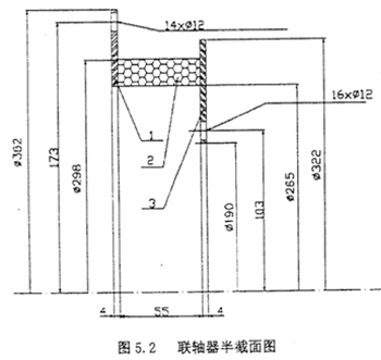 根據(jù)實(shí)際情況觀察可知橡膠塊左右分別有兩塊鋼板,析上均有一些圓孔,通過實(shí)際測量得到聯(lián)軸器的基本尺寸和形狀。由于聯(lián)軸器為軸對稱圖形,故只畫出其截面圖(圖5.2)。