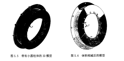 進(jìn)行體相減,生成系列小孔。主要用到Subtract命令,先選擇兩個(gè)大面,然后選上所有的小圓柱體。最后有Replot命令生成新圖形。結(jié)果如圖5.6所示。