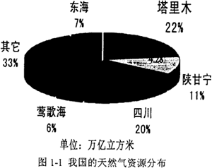 我國天然氣總資源量為3.8×1013m3。其中在面積為560,000km2的塔里木盆地,天然氣資源量就達8.39×l012m3。其中累計已探明地質(zhì)儲量4.19×l011m3,剩余可采儲量2.79×l011m3,是國內(nèi)天然氣資源量及剩余可采儲量最豐富的氣區(qū)。預(yù)計今后五至十年,累計探明地質(zhì)儲量可達1×1012m3。此外,從圖1-1可以看到,陜西、四川、青海等地的天然氣儲量也都十分可觀,氣田分布的西傾狀況比較明顯。