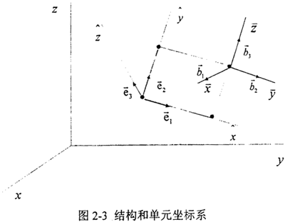 ●節(jié)點坐標(biāo)系行(,,),反映節(jié)點的平動與轉(zhuǎn)動;正交基矢量為bi。
