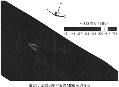 首先觀察裂尖附近的MISES應(yīng)力分布,如圖2-10。按以針狀鐵素體和塊狀鐵素體組織為主的X70鋼級(jí)管線鋼的平均屈服強(qiáng)度500~600MPa估算,計(jì)算給出的裂尖前部塑性區(qū)長(zhǎng)度大約在3個(gè)單元長(zhǎng)度以內(nèi),即0.15m左右。