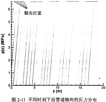 圖2-11直觀地給出了內(nèi)壓10MPa,裂紋速度216m/s時(shí)一維管道氣體壓力模型(L=1.5D)下的管壁壓力沿軸向的分布。每條曲線的衰減起始點(diǎn)即為該時(shí)刻的裂尖位置。圖中裂尖壓力約為6.6MPa。