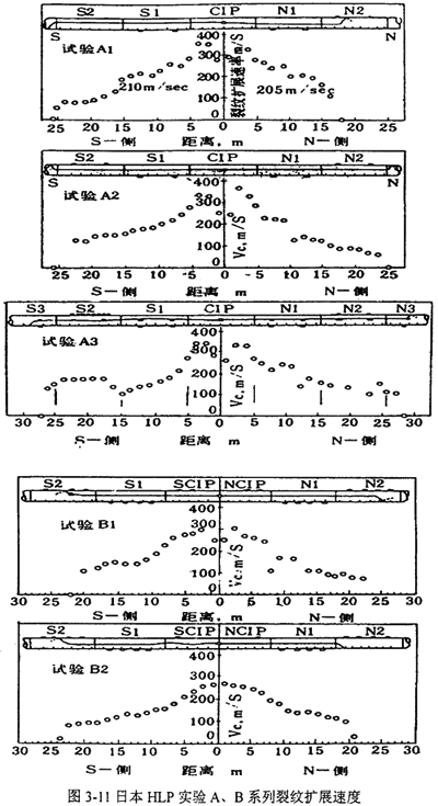 速度曲線表明,在A類實驗中,裂紋起裂后,在韌性較低的CIP擴展速度達以300m/s以上。裂紋進入實驗管后,裂紋擴展速度隨著裂紋的擴展而下降,實驗A3的南側有例外,裂紋從S1到S2管裂紋擴展速度增大,這是由于韌性排列時S2管的韌性例外地比S1低。在B類實驗中,CIP管的最大裂紋擴展速度率為300m/s(B1)和270m/s(B2),這與其韌性較高有關。
