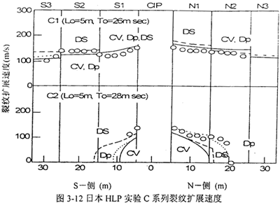 圖3-11、圖3-12表示日本HLP實驗中裂紋擴展速率隨擴展距離的變化,空心點為實測值。通過對易發(fā)生斷口分離(斷口分離現象將在下一章中介紹)的控軋(CR)鋼和調質(QT)鋼兩種材料的臨界止裂韌性的測試,沒有發(fā)現大的差異,說明斷口分離現象對動態(tài)延性斷裂的止裂能力影響不大。
