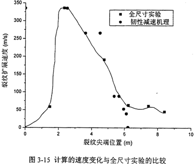 本文通過上述方法,對(duì)圖3-9至圖3-12中的全尺寸實(shí)測(cè)斷裂速度曲線結(jié)果進(jìn)行了校核,得到了比較吻合的結(jié)果,F(xiàn)以聯(lián)盟管道第一次實(shí)驗(yàn)IE段為例,設(shè)定擴(kuò)展的初速度為330m/s,速度變化的計(jì)算值同實(shí)驗(yàn)對(duì)比如圖3-15所示: