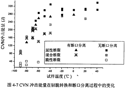 圖4-7選擇的管線鋼在實驗溫度范圍內同時經歷了韌脆轉化和斷口分離,對上述結論給予了證實,并可以看到發(fā)斷口分離的試件的韌性稍低于未發(fā)生斷口分離的試件。