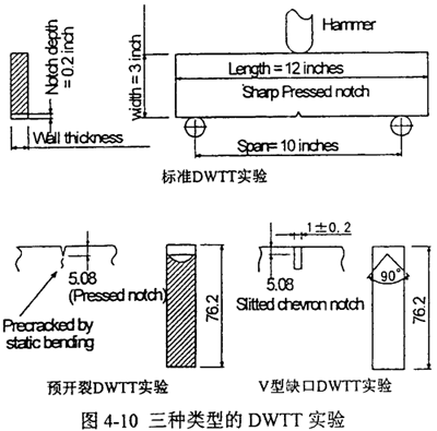 實(shí)驗(yàn)證實(shí),對(duì)有上臺(tái)能的控軋鋼進(jìn)行的實(shí)驗(yàn)中,標(biāo)準(zhǔn)DWTT實(shí)驗(yàn)比夏比沖擊實(shí)驗(yàn)在評(píng)價(jià)延性裂紋擴(kuò)展行為上有更好的對(duì)應(yīng)關(guān)系。但對(duì)于高韌性的淬火回火鋼,標(biāo)準(zhǔn)DWTT試樣由于在起裂過(guò)程中吸收了大量的功,致使裂紋擴(kuò)展的應(yīng)變速度過(guò)低而與真實(shí)擴(kuò)展?fàn)顩r不符。采用靜態(tài)預(yù)制裂紋DWTT試樣或雙試樣DWTT法是解決這一問(wèn)題的兩種方案,如圖4-10所示。