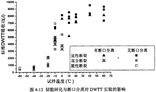 圖4-13比較了在延性和脆性斷裂中有無(wú)斷口分離試樣的DWTT韌性值。結(jié)論與CVN實(shí)驗(yàn)類似,發(fā)生斷口分離的試樣,測(cè)得韌性值略低。