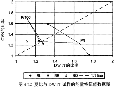 圖4-22是CVN與DWTT試樣的上臺(tái)能量特征值數(shù)據(jù)圖?偟膩碚f,CVN與DWTT試樣的特征能量比率有較好的一致性。圖中P/100的符合性比P/I更好,很大程度上是因?yàn)镃V100、DWTT-100比CVN-I、DWTT-I的獲得方法更為明確。