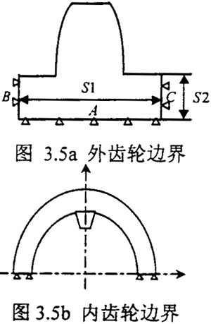 對于外齒輪Daimler-Benz公司選取邊界的方法是先取半個齒輪進行有限無計算,這是從整體來考慮問題,然后根據(jù)計算的結(jié)果來選擇邊界的范圍,其所定的邊界寬度如圖3.5a,S1=6.1m,m是齒輪的模數(shù)。Chaber所取的邊界的方法是考慮圣維需原理,其所定的邊界深度為S2=1.5m。綜合以上兩者的研究,用有限無計算外齒的變形,計算模型的邊界范圍可。
