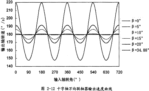 十字軸萬向聯(lián)軸器的機(jī)構(gòu)實(shí)際上是球面四連桿機(jī)構(gòu),它的空間運(yùn)動(dòng)關(guān)系早已解析出。當(dāng)輸入、輸出兩軸線的夾角為β輸入軸轉(zhuǎn)角фi轉(zhuǎn)速ωi,輸出軸轉(zhuǎn)角фo,轉(zhuǎn)速ωo,則它們的位移關(guān)系式為:tgфi=tgф0cosβ,速度關(guān)系式為:=,曲線圖如圖2-12(此圖的目的主要是為了后面的驗(yàn)證所示。