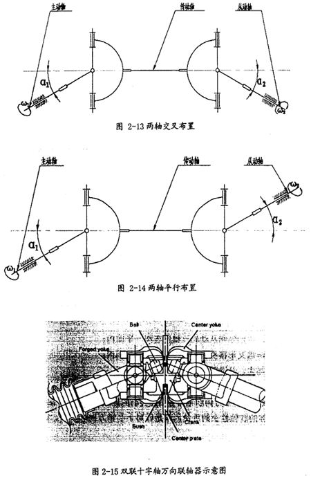 在這樣的理論指導(dǎo)下,人們制作了圖2-15所示的雙聯(lián)十字軸等角速萬向聯(lián)軸器。它的關(guān)鍵結(jié)構(gòu)就是中間的軛機(jī)構(gòu),它保證了兩軸同軛(相當(dāng)于中間軸)的夾角始終相等,從而實(shí)現(xiàn)等角速傳動(dòng)。