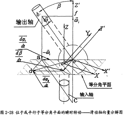 如圖2-28所示,輸入軸與輸出軸通過一個(gè)萬向聯(lián)軸器J聯(lián)接,兩軸夾角β為變量,輸出軸相對(duì)于輸入軸存在瞬時(shí)轉(zhuǎn)動(dòng)——滑動(dòng)軸,用矢量