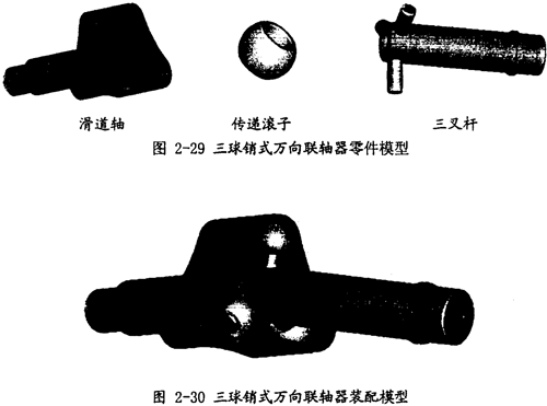 三球銷式萬向聯(lián)軸器是一種被廣泛應(yīng)用的聯(lián)軸器,已有近30年的歷史,它同后面敘述的兩種聯(lián)軸器同屬三叉式萬向聯(lián)軸器,它們的傳動(dòng)原理在本文的第三章中有詳細(xì)的描述,是一種運(yùn)動(dòng)規(guī)律十分復(fù)雜的聯(lián)軸器。它的裝配模型和零部件模型分別如圖2-30、圖2-29所示.在聯(lián)軸器轉(zhuǎn)動(dòng)時(shí),傳遞滾子既可相對(duì)滑道軸中的滑道軸向移動(dòng),也可沿三叉桿的軸頸轉(zhuǎn)動(dòng)和徑向移動(dòng),以補(bǔ)償兩軸夾角的變化。