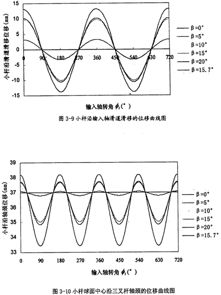 由曲線圖3-9可以看出,小桿沿滑道的位移隨兩軸夾角β的增大而增大,變化量也比較大,變化頻率為一個(gè)回轉(zhuǎn)周期1次。這可以作為三叉桿萬(wàn)向聯(lián)軸器設(shè)計(jì)中,小桿長(zhǎng)度的設(shè)計(jì)依據(jù)。