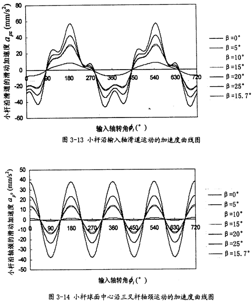 由曲線圖3-14可以看出,小桿球面中心P沿軸頸的線加速度,變化頻率為一個(gè)回轉(zhuǎn)周期2次。隨兩軸夾角β的增大其最大值增長(zhǎng)較快,它的值可以作為動(dòng)力分析和設(shè)計(jì)計(jì)算的重要依據(jù)。