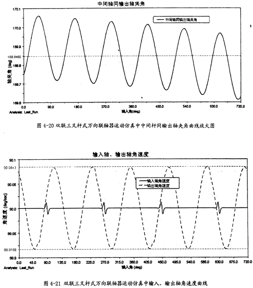 由圖4-20可以看出,中間桿同輸出軸間的夾角變化也呈現(xiàn)一定的規(guī)律,在每-個(gè)回轉(zhuǎn)周期中,它的變化頻率為3次。結(jié)合圖4-19、圖4-20可知中間桿同輸入軸及輸出軸夾角的變化頻率是不-樣的,這是雙聯(lián)三叉桿式萬(wàn)向聯(lián)軸器有別于單聯(lián)三叉桿式萬(wàn)向聯(lián)軸器的一種特性。