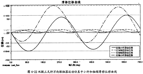 由圖4-22可以看出,雙聯(lián)三叉桿式萬(wàn)向聯(lián)軸器在運(yùn)轉(zhuǎn)的過程中,左右兩端的小桿滑移位移量幾乎相等,左右兩端軸頸的滑移位移量也接近等值,且軸頸的滑移位移量比小桿沿滑道滑動(dòng)的位移量要小得多,這同單聯(lián)三叉桿式萬(wàn)向聯(lián)軸器的特性是相同的。