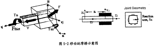移動副產(chǎn)生摩擦的示意圖如圖5-2所示。在這種運動副中只會產(chǎn)生逆向于移動方向v(如圖5-2中藍色箭頭所示)的摩擦力Ffrict(如圖5-2中紅色箭頭所示),它的產(chǎn)生主要由三種因素,即構(gòu)件間相互作用的徑向力F、構(gòu)件間相互作用的扭矩Tn、構(gòu)件間相互作用的彎矩Tm(這三種力如圖5-2中綠色箭頭所示)。在施加由這些作用力產(chǎn)生的摩擦力時,要考慮徑向力F的大小、等效作用臂長Rn(如圖5-2中右邊圖所示運動副間的重疊量和重疊量的變化情況、扭矩Tn的大小和它的等效反作用臂長Rn、彎矩Tm的大小和彎矩的反作用臂長XS(如圖5-2中間圖所示)。另外還得考慮靜摩擦系數(shù)、動摩擦系數(shù)及預(yù)載荷的作用。