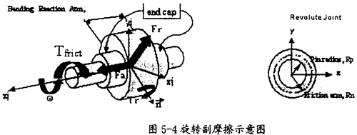 旋轉(zhuǎn)副產(chǎn)生摩擦的示意圖如圖5-4所示。在這種運動副中只會產(chǎn)生逆向于旋轉(zhuǎn)方向ω(如圖5-4中藍色箭頭所示)的摩擦扭矩Tfrict(如圖5-4中紅色箭頭所示),它的產(chǎn)生主要由三種因素,即構(gòu)件間相互作用的徑向力Fr、構(gòu)件間相互作用的軸向力Fa、構(gòu)件間相互作用的彎矩Tr(這三種力如圖5-4中綠色箭頭所示)。在施加由這些作用力產(chǎn)生的摩擦力時,要考慮徑向力Fr的大小、圓柱半徑RP(如圖5-4右圖所示)、軸向力Fα的大小、摩擦半徑Rn的大小(如圖5-4右圖所示)、彎矩Tm的大小和彎矩的反作用臂長(即旋轉(zhuǎn)副的長度,如圖5-4中左圖所示),另外還得考慮靜摩擦系、動摩擦系數(shù)及預(yù)載荷的作用。