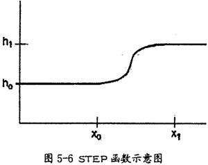 在ADAMS中,STEP函數(shù)近似一個標(biāo)準(zhǔn)的數(shù)學(xué)STEP函數(shù)(沒有不連續(xù)性),并逐步逼近數(shù)值,例如:驅(qū)動或者力,向上或者向下或者打開和關(guān)閉。它的函數(shù)圖形如圖5-6所示。格式同各參數(shù)說明如下: