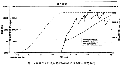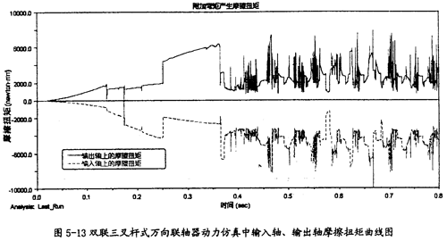 由圖5-12可以看出,雙聯(lián)三叉桿式萬向聯(lián)軸器在動力仿真的過程中,其一端的三個小桿所受的摩擦力的合力變動較有規(guī)律,其值在開始一段平滑,其后幾乎以0為中心波動。由于這三個摩擦力的方向均平行于輸入軸或輸出軸軸線,故此合力會在輸入軸和軸出軸上產(chǎn)生軸向的力,在輸入軸和輸出軸上產(chǎn)生摩擦扭矩。如取其水平較高值60牛來計算,它產(chǎn)生的摩擦扭矩為270N·mm(60×0.3×15=270,其中0.3為動摩擦系數(shù),15為摩擦半徑),此值相對圖5-13中的值而言相當(dāng)小。
