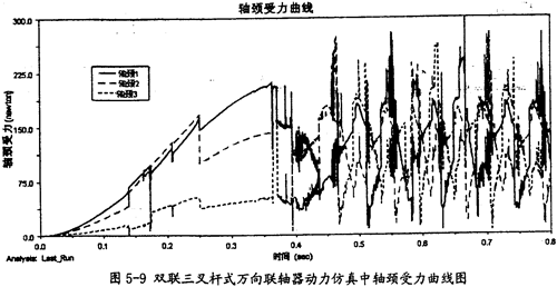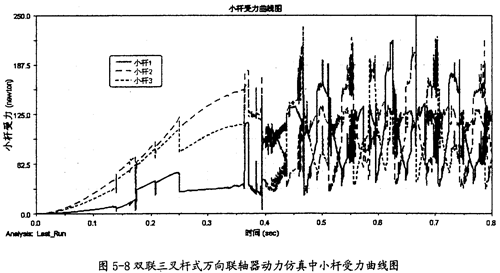 由圖5-9可以看出,雙聯(lián)三叉桿式萬向聯(lián)軸器在動力仿真的過程中, 雙聯(lián)三叉桿一端的三軸頸同內(nèi)球頭的圓柱副上的作用力變化趨勢同圖5-8中的小桿變化趨勢是相同的。由于它們的受力變動復(fù)雜,故這三力在雙聯(lián)三叉桿一端上的向量和也可能不為0。這樣在雙聯(lián)三叉桿上也會產(chǎn)生附加彎矩的作用。而且軸頸受力平均較小桿的受力要大。