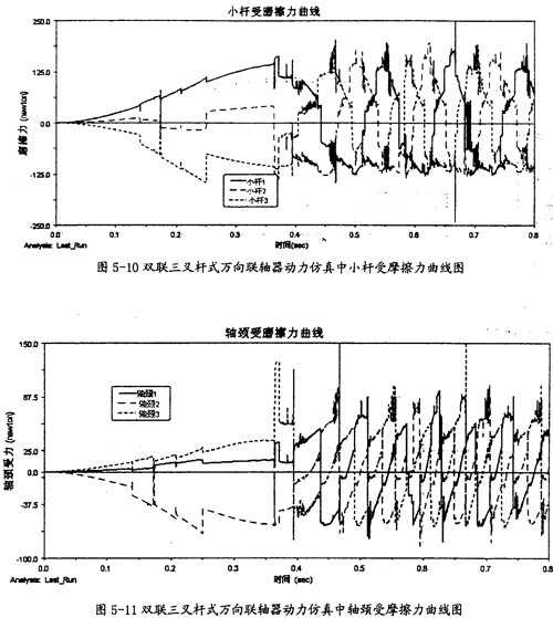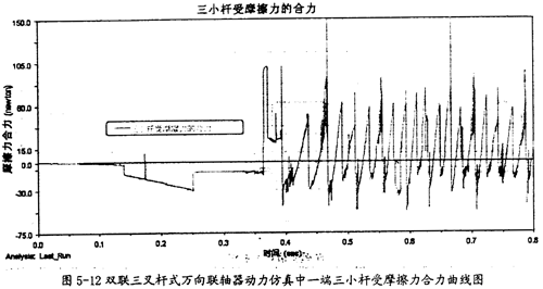 由圖5-11可以看出,雙取三叉桿式萬向聯(lián)軸器在動力仿真的過程中,其一端的三內(nèi)球頭同軸頸間的摩擦力變化相當(dāng)有規(guī)律。當(dāng)內(nèi)球頭相對軸頸運動反向時,它們就會在正負(fù)間有規(guī)律的切換。但在這里產(chǎn)生摩擦力的平均大小要較小桿上的小得多。