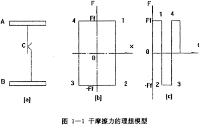 雙線性模型是非線性遲滯系統(tǒng)模型中最簡單的一種,而且也是最為久遠(yuǎn)的模型,對(duì)于它的初始機(jī)理研究最早可追溯到三十年代的Deo Hartog,他在研究干摩擦?xí)r提出了干磨擦的理想模型,他認(rèn)為在一個(gè)具有干摩擦面的單自由度系統(tǒng)中,干摩擦力隨相對(duì)滑移位移的關(guān)系可用一矩形來表示,如圖1-1所示。當(dāng)該系統(tǒng)受到外力激勵(lì)發(fā)生運(yùn)動(dòng)時(shí),干摩擦力總是與運(yùn)動(dòng)速度反向而且阻礙運(yùn)動(dòng),進(jìn)而耗損系統(tǒng)的能量,從時(shí)域的角度看,干摩擦力的波形為矩形波,Den Hartog還按能量耗散相等原理,把理想干摩擦等效成粘性阻尼。實(shí)際上干摩擦交界面,在外力小于摩擦力時(shí),兩邊就有變形,隨著外力的增加,此變形隨之增大,這是因?yàn)榻唤缑鎯蛇叺奈镔|(zhì)有一定的彈性。即使兩邊有較大的滑移時(shí),交界面上的干摩擦力仍然不是常數(shù),而是隨振幅的增大而緩慢上升的。Earlestes等人對(duì)此作了描述,認(rèn)為一旦交界面有了滑移,干摩擦的線性力不是常數(shù)(4Ffπ),而是與相對(duì)位移X有關(guān),從Ff變到4Ff/π,表達(dá)式為