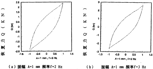 圖2-9(見26頁)表示激振頻率為1OHz,振動位移幅值為±2毫米的位移和恢復力時間歷程圖,圖2-10(見26頁)、圖2-11(見27頁)為對應的遲滯回線圖。圖2-l2(見27、28頁)表示激振頻率為IHz,振動位移幅值分別為±(1-8)毫米的位移一恢復力圖,圖2-14(見29頁)則為圖2-12的合圖,由圖2-14同頻率不同振幅的八條遲滯回線分析可知,大撓度剛絲繩彈性聯(lián)軸器的動剛度與振動幅值有關,同時,從遲滯回線面積(表示聯(lián)軸器阻尼所耗散的能量)可知聯(lián)軸器的阻尼與振動幅值也有關,即聯(lián)軸器的動剛度和阻尼均是振幅的非線性函數(shù)。