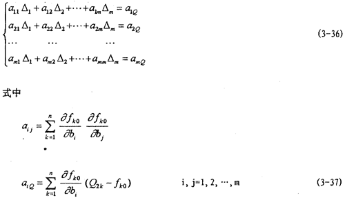 ,并解方程組(3-36)得新的△i,進而得bi。這種過程可以重復(fù)進行,直至|△t |的值小到給定的精度為止。